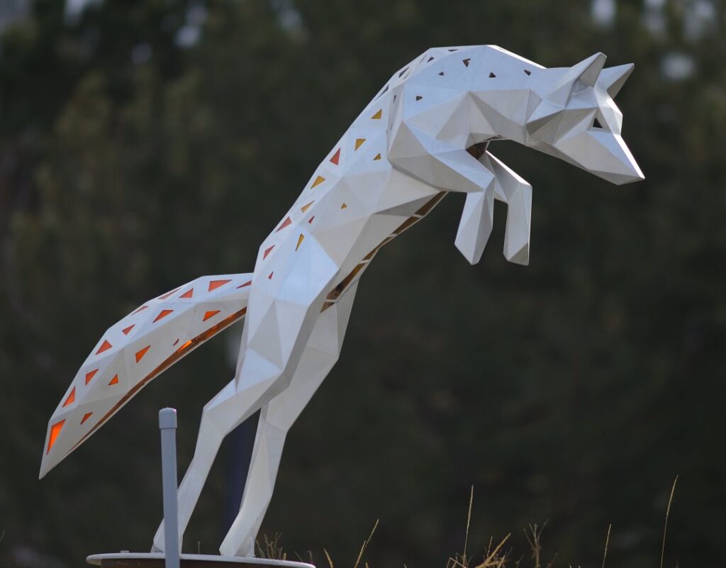 The Fox Sculptures are 2x life-size and weigh approximately 100 lbs each. They are designed to be lighted from the bottom for nighttime viewing.