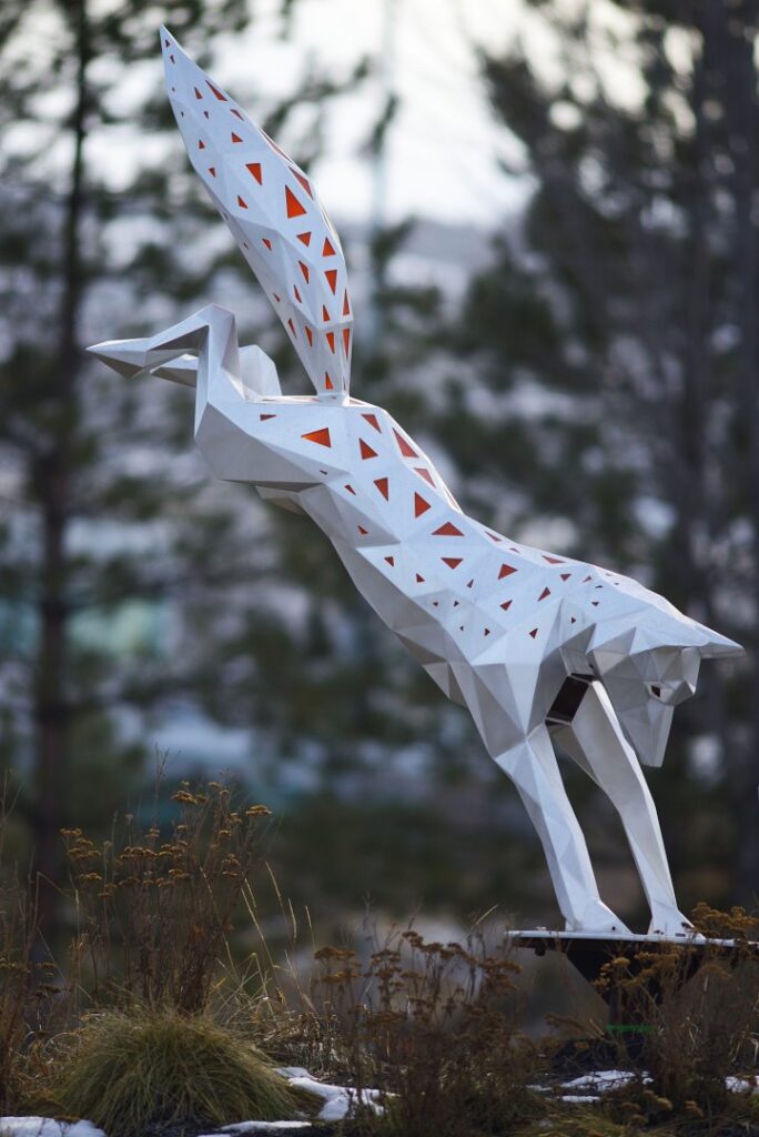 This set of four sculptures depicts a local Indigenous story about Fox and Coyote trading tails. Fox brings Coyote back to life after jumping over him. The sculptures are arranged in a circle and positioned at the four directions of the compass to reflect indigenous values.